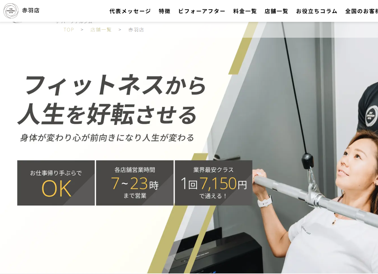 THE PERSONAL GYM 赤羽店は、赤羽駅から徒歩圏内に立地するパーソナルジムです。経験豊富なトレーナーが一人ひとりに合わせたトレーニングと食事提案を行い、無理のない方法でダイエットやボディメイク、生活習慣改善をサポートします。完全オーダーメイドのメニューにより、初心者でも安心して取り組める構成で、手ぶらで通える環境も整っています。営業時間が朝〜夜まで広く、通いやすさも魅力です。口コミでも「初心者でも続けやすい」「効果を感じやすい」と評価されています。